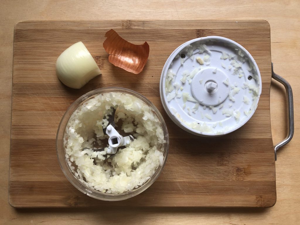 Schil de ui en hak deze fijn. Ik heb een handmatige touwtrimmer gebruikt die ik erg handig vind. Als je hem wilt kopen kun je hem vinden door HIER te klikken.