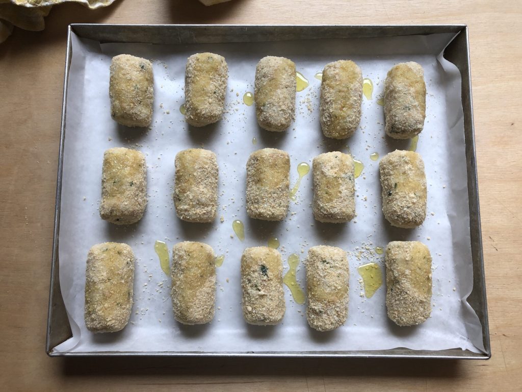 Bak de kroketten in een voorverwarmde statische oven op 180° voor 25 minuten plus een paar minuten op de grillstand tot ze goudbruin zijn.