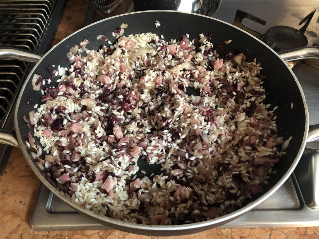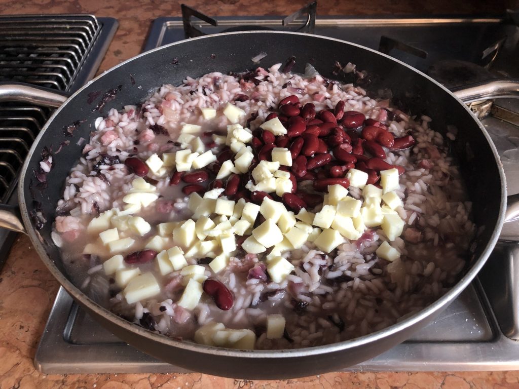 Bereiding van de risotto met bonen en radicchio