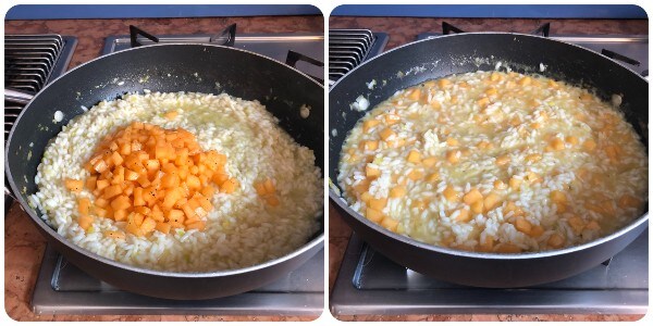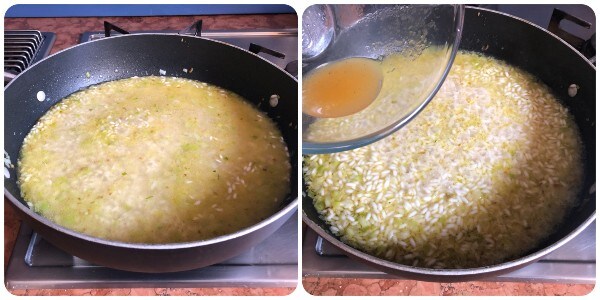 • Blus het daarna met de witte wijn en begin, zodra het verdampt is, beetje bij beetje kokend hete bouillon toe te voegen, wachtend tot de vloeistof bijna volledig is geabsorbeerd voordat je de volgende toevoegt. Voeg ook het sap toe dat door de meloenblokjes is uitgelekt.
