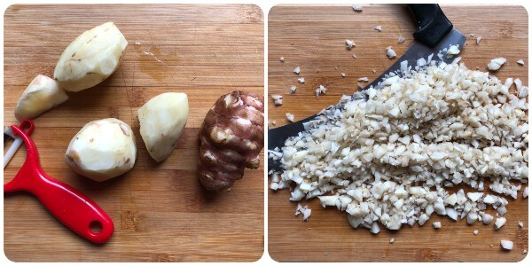 Was de aardpeer heel goed onder stromend water, wrijf ze met een borsteltje om alle aarde resten te verwijderen. Schil ze met een dunschiller (als ze erg hobbelig zijn, is het niet eenvoudig, maar het is ook niet nodig om alle schil te verwijderen die gerust gegeten kan worden. Verwijder het meeste, laten we zeggen!). Hak ze dan fijn: ik heb een hakmes gebruikt.