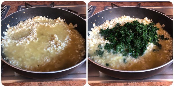 Wanneer de wijn verdampt is, voeg een paar lepels van het kookwater van de zwarte kool toe en de eerder in stukjes gesneden bladeren.Breng de rijst aan de kook door telkens de nodige hoeveelheid water toe te voegen en pas het zout indien nodig aan.