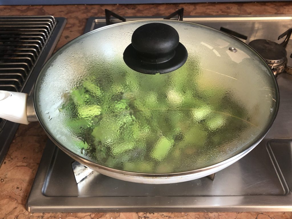Doe het deksel erop en kook op middelhoog vuur tot de asperges zacht maar nog steeds knapperig zijn. Roer af en toe. Het duurt ongeveer 10 minuten.