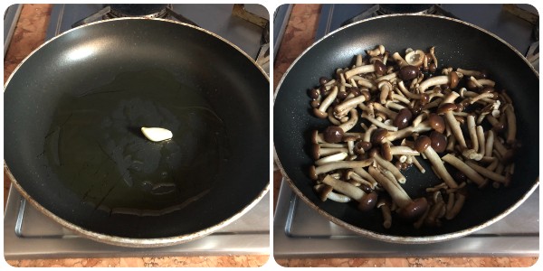 Verhit in een koekenpan een paar eetlepels olie en bak daarin een teentje knoflook, geschild maar heel. Voeg dan de goed uitgelekte chiodini toe en bak ze 3/4 minuten.