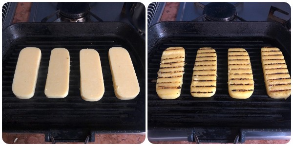 Verwarm goed een grillpan en bestrijk deze licht met olie voordat je de plakken polenta erop legt. Grill ze 2/3 minuten per kant totdat mooie goudbruine en krokante strepen verschijnen. Op deze manier worden de plakken stevig, licht krokant van buiten en zacht van binnen.