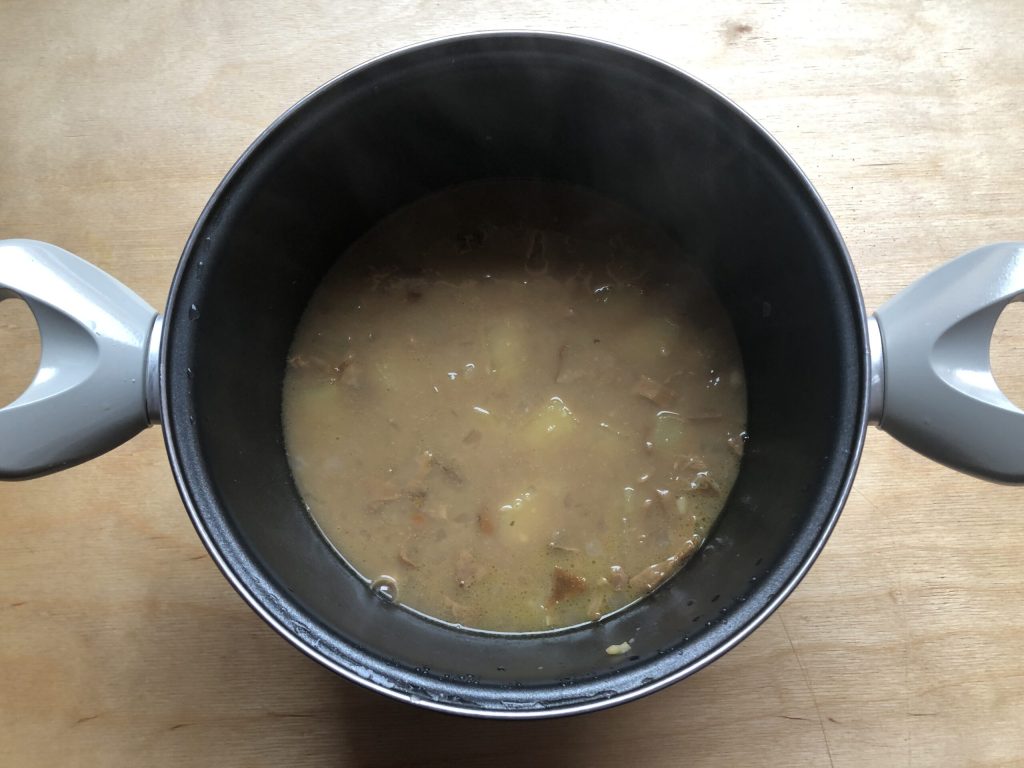 • Voeg op dit punt de verkruimelde kastanjes toe en giet 600 ml vloeistof (warm) in de steelpan, tussen het weekwater van de paddenstoelen en de bouillon. Ik had bijvoorbeeld 250 ml weekwater en voegde 350 ml bouillon toe.