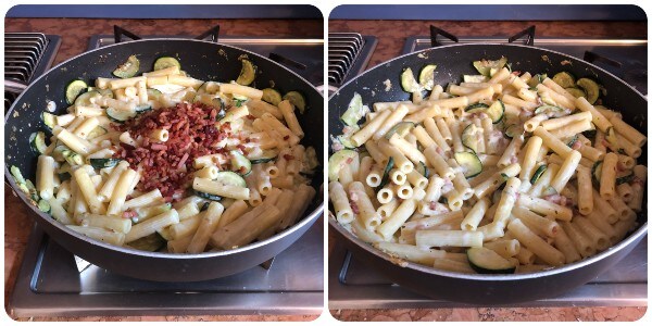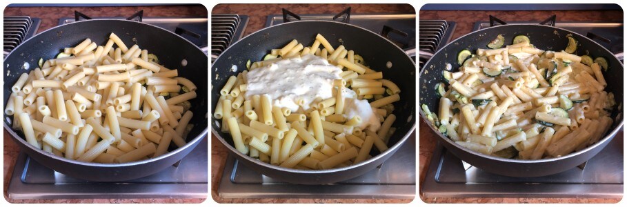 Kook ondertussen de sedanini in ruim kokend gezouten water; giet ze af als ze gaar zijn, bewaar een beetje kookwater en doe ze direct in de braadpan met de courgettes. Voeg de kaassaus toe en meng alle ingrediënten goed. Als de saus te dik is, verdun deze dan met een paar eetlepels van het bewaarde kookwater.