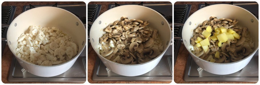 Laat het even sissen en voeg dan de bloemkool, champignons en aardappelen toe.