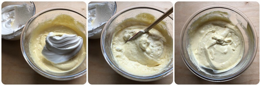 Voeg ten slotte in meerdere keren de opgeklopte eiwitten toe, waarbij je ze voorzichtig van onder naar boven vouwt om te voorkomen dat het mengsel in elkaar zakt.