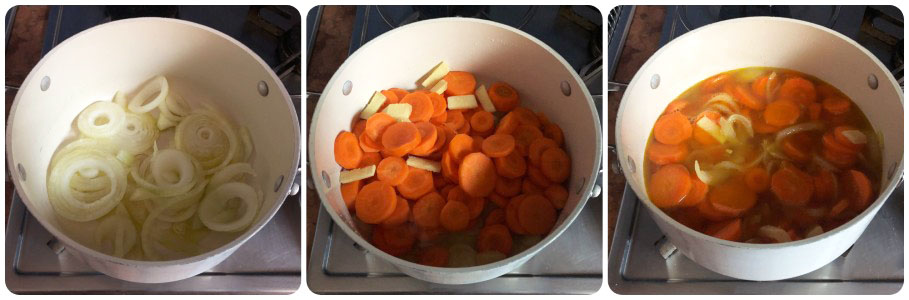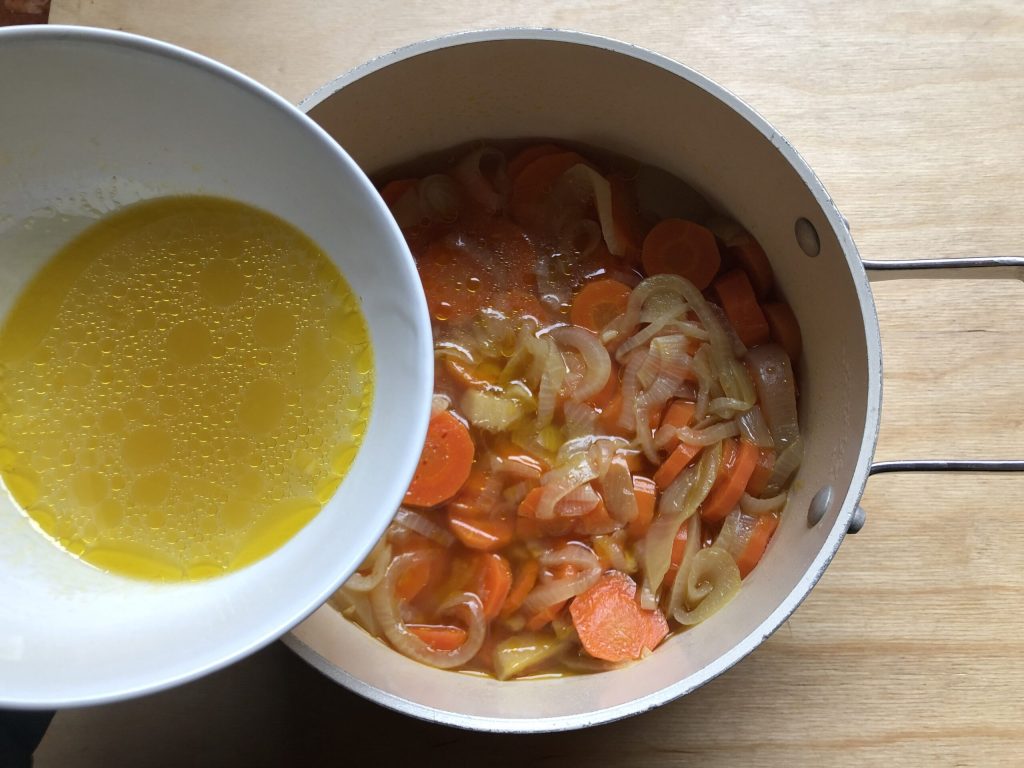 Voeg vervolgens de wortels en gember toe, laat een paar minuten meebakken, giet dan de hete bouillon erbij. Breng op smaak met zout en peper.