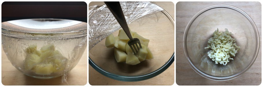 Kook de aardappelen, pureer ze met het juiste gereedschap en verzamel de puree in een kom. Ik kookte de aardappelen in de magnetron om tijd te besparen, maar je kunt dit ook op het fornuis doen, te beginnen met koud gezouten water. In dat laatste geval raad ik aan ze niet te schillen zodat ze minder water opnemen tijdens het koken. Schil ze echter als je ze in de magnetron kookt; was ze dan en snijd ze in stukjes zonder ze te drogen. Doe ze in een glazen kom, voeg een eetlepel water toe, bedek met folie en kook op vol vermogen (in mijn geval 900 W) gedurende vier minuten of totdat ze zacht zijn.