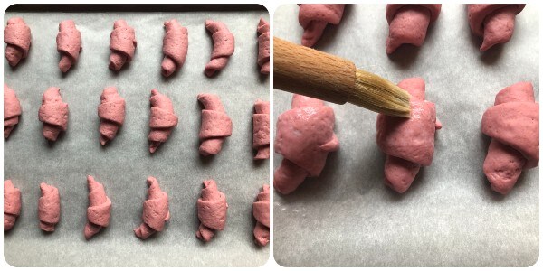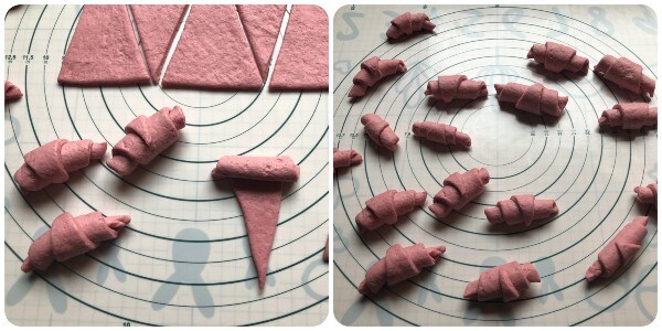 De roze croissants zijn heerlijk zacht en kunnen gevuld worden met vleeswaren of kaas. Ze zijn ook heerlijk zo… zonder iets. Geniet ervan! Paola