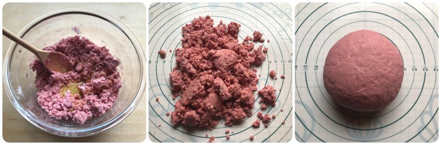 Voeg tenslotte de olie en het zout toe. Werk de ingrediënten eerst in de kom, breng het deeg dan over op het werkblad en kneed krachtig met de handen tot je een glad en homogeen deeg krijgt. Als het deeg te hard is, voeg dan nog wat melk toe. Ik hoefde dit niet te doen. Als het daarentegen te zacht is, voeg dan een beetje bloem toe. Uiteraard kan deze hele operatie ook met een keukenmachine of mixer worden gedaan.