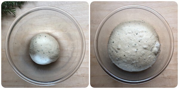 Doe het deeg op het aanrecht, werk het even met de handen en vorm een bal. Leg deze in een kom, dek af met folie en laat rijzen tot het volume verdubbeld is op een warme plek, beschermd tegen tocht. Zoals altijd hangt de rijstijd sterk af van de omgevingstemperatuur en kan het variëren van twee tot drie uur.