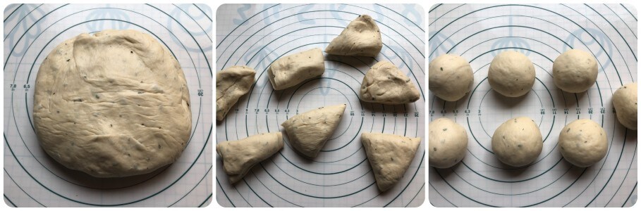 Aan het einde van deze eerste rijs, verdeel het deeg op het werkblad in zeven stukjes van ongeveer 70 g elk. Vorm zeven bolletjes.
