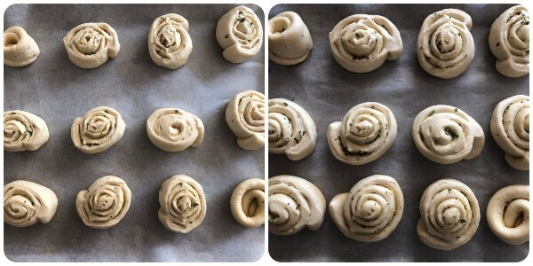 Leg de rozemarijnbroodjes na elkaar op twee met bakpapier beklede bakplaten en laat ze nog een uur rijzen.
