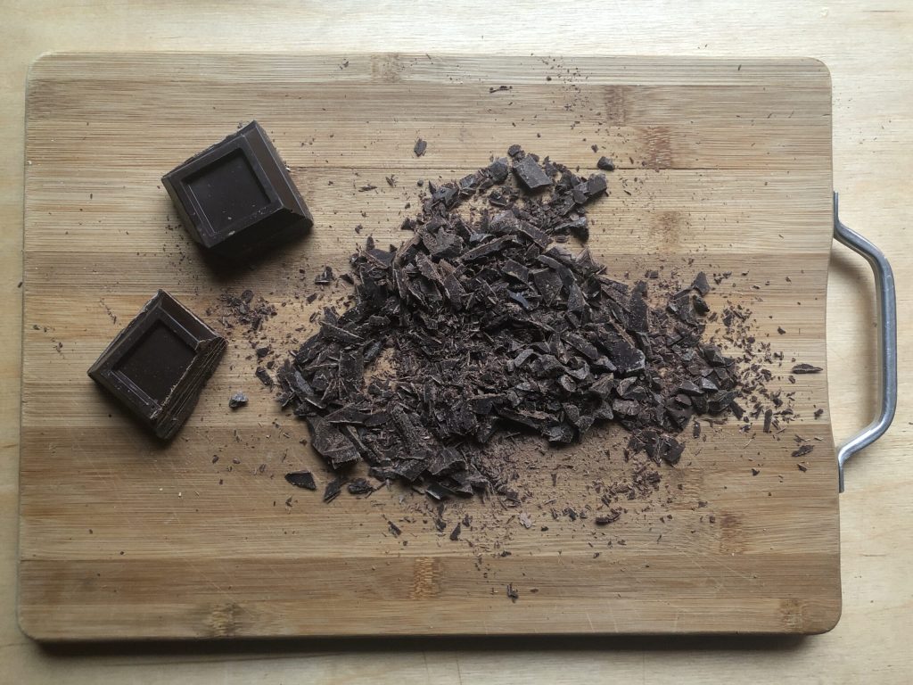• Hak de pure chocolade in niet te dunne stukjes. Op deze manier smelten ze aangenaam tijdens het eten.