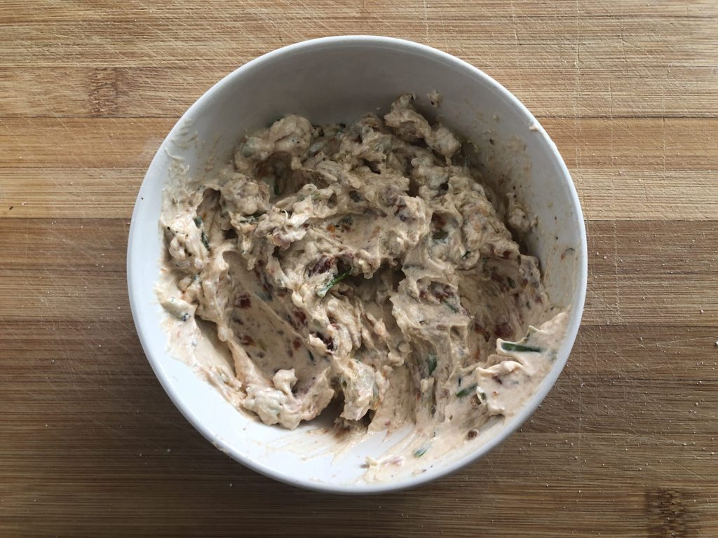 • Doe de verse kaas, de goed uitgelekte zongedroogde tomaten, de ontzoute kappertjes en de fijngesneden bieslook in een mixer en mix alles in meerdere keren. Ik heb meerdere keren gemixt op snelheid 5/6 en telkens het mengsel naar het midden van de kom geschraapt.