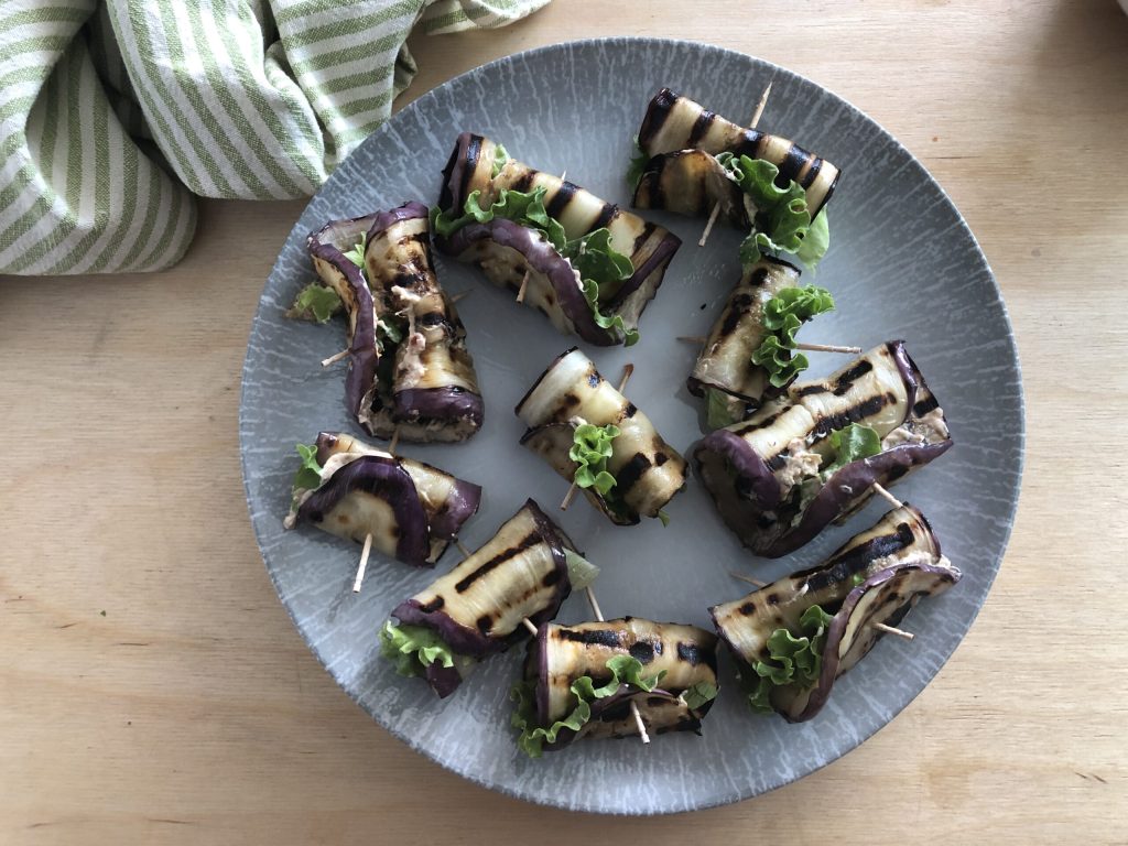 • Leg een gegrilde aubergineplak op een snijplank, verdeel er een beetje kaascrème over en eindig met een klein blaadje zachte sla of kropsla.