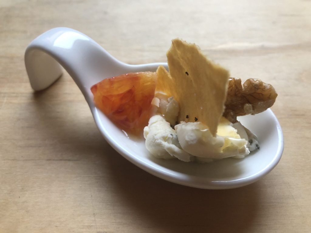 • Plaats een stukje sinaasappelpartje en een klontje gorgonzola met mascarpone in een kleine eenpersoonslepel. Als je wilt, kun je zachte gorgonzola gebruiken. Ik heb gekozen voor gorgonzola gemengd met mascarpone omdat het iets milder is en ik vond het beter geschikt voor dit soort bereiding.