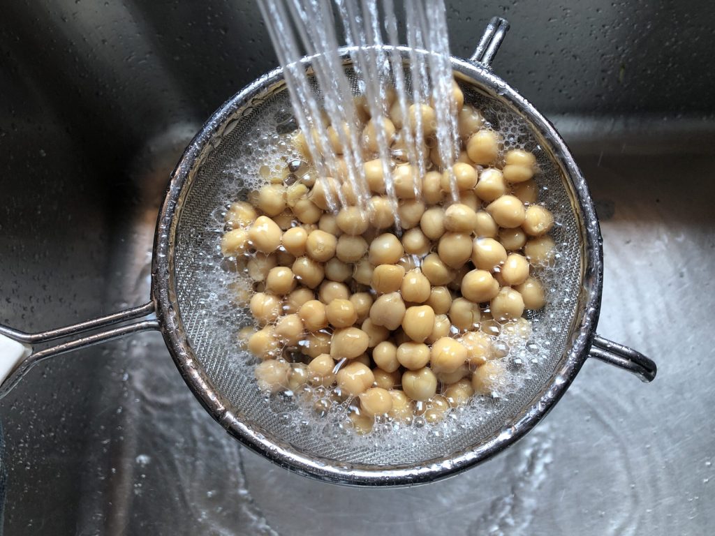 • Giet de kikkererwten af en spoel ze goed af onder stromend water.