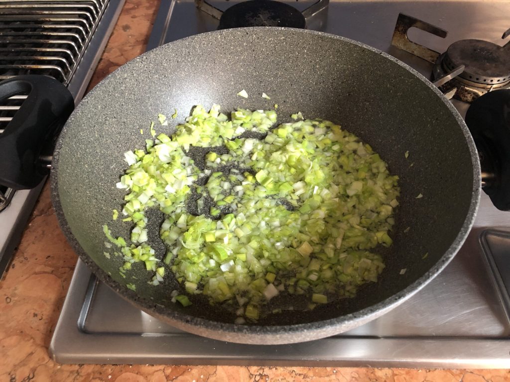 • Verhit een paar eetlepels olie voordat je de prei samen met een paar eetlepels water toevoegt.
