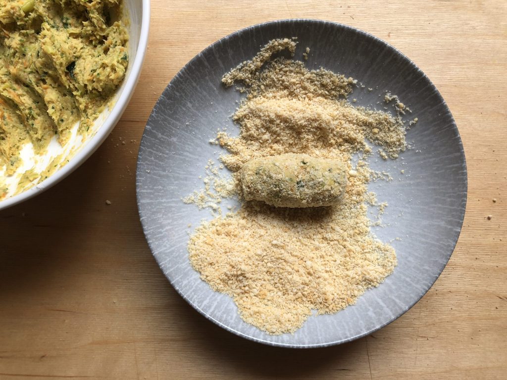 • Rol ze dan door een mengsel van paneermeel en geraspte kaas. Bereid naar eigen inzicht deze twee ingrediënten in kleine hoeveelheden en maak meer wanneer het nodig is.