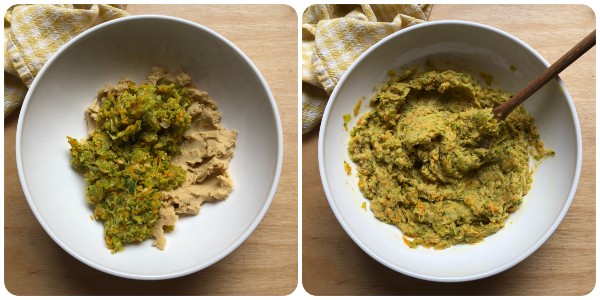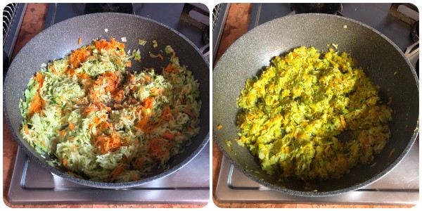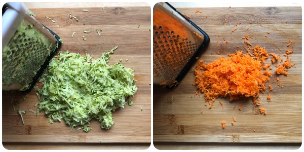 • Snijd de uiteinden van de courgette en de wortel, was ze en rasp ze met een rasp met middelgrote gaatjes.