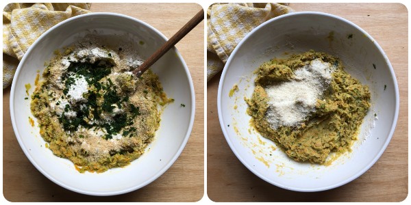 • Voeg vervolgens de bloem, paneermeel, wat gehakte peterselie en geraspte kaas toe en meng alle ingrediënten goed door elkaar. Het wordt een vrij zachte massa, maar als het te slap is, voeg dan nog wat kaas of bloem toe. Breng eventueel op smaak met zout.