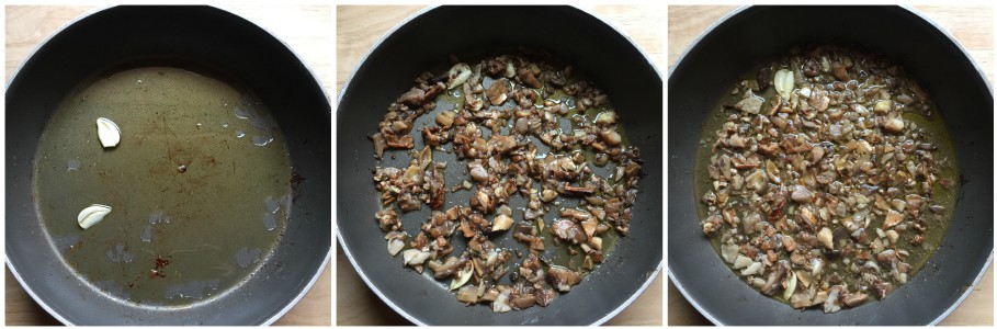 Voeg in dezelfde pan een scheutje olie en een teentje knoflook toe (gepeld, doormidden gesneden en zonder de kern). Laat even bakken voordat je de champignons die eerder grof gesneden zijn, toevoegt.