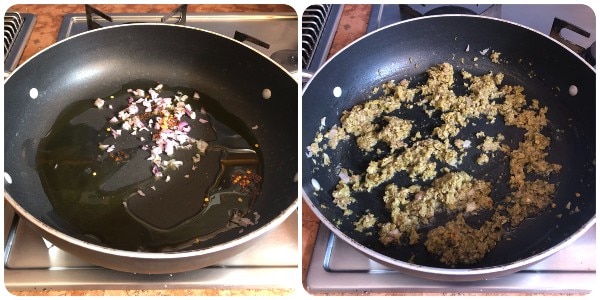 • Verwarm in een kleine koekenpan een scheutje olie en rooster het geurende mengsel tot het goudbruin en knapperig is. Zet dan het vuur uit, haal het uit de pan om te voorkomen dat het verbrandt en zet het apart.