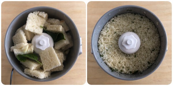• Verwijder de korst van de sneetjes witbrood, snijd ze in stukjes en doe ze in een hakmolen samen met een halve knoflookteen zonder de centrale kiem en twee basilicumblaadjes. Hak alles grof.