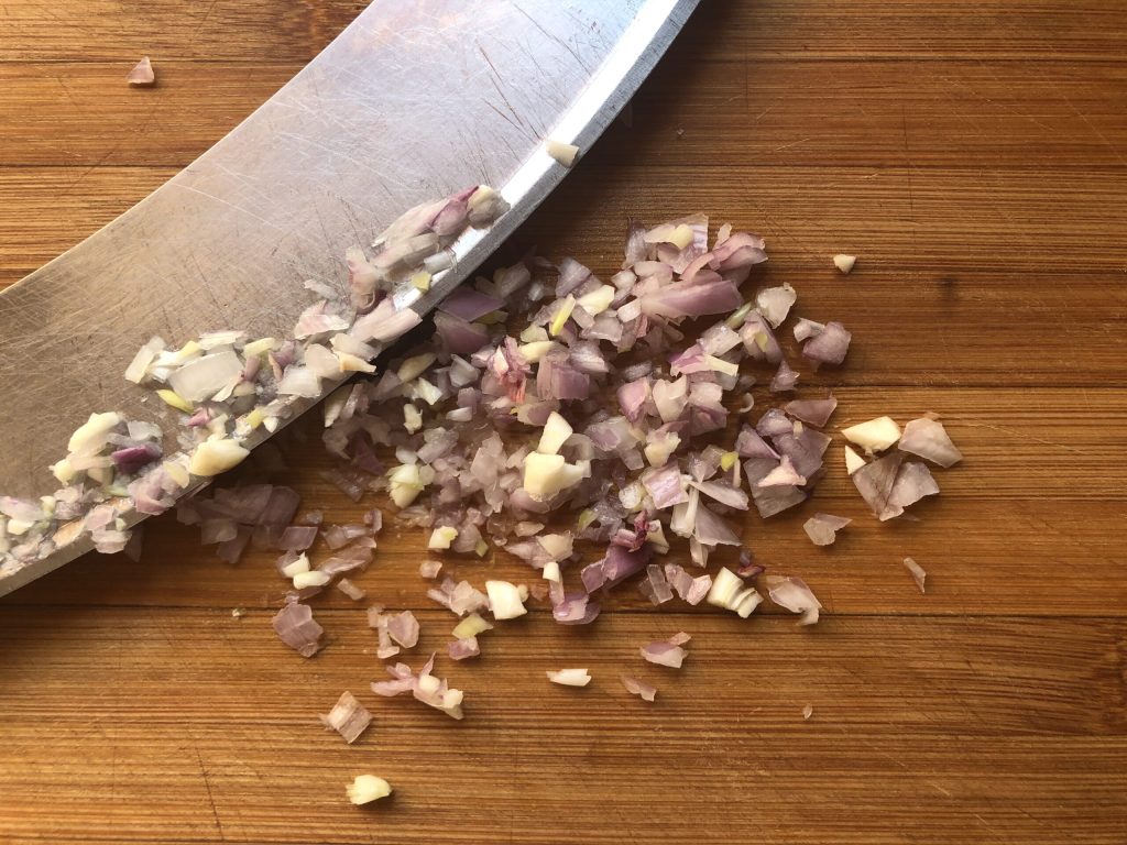 • Pel de knoflookteen en de sjalot en hak ze fijn.