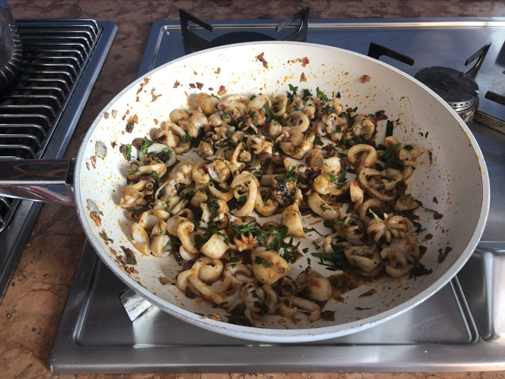 • Fruit het geheel een paar minuten roerend, voeg dan de pijlinktvissen toe en laat ze snel een minuut op smaak komen.