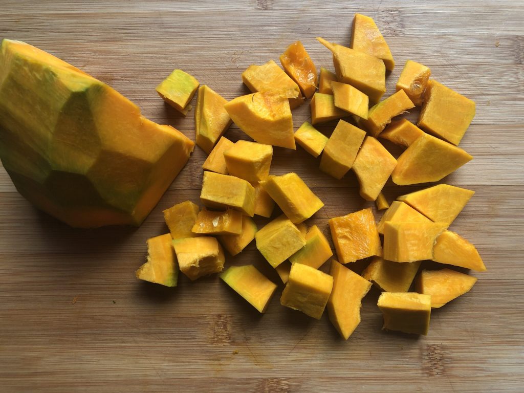 Verwijder de schil en alle zaden en draden van de pompoen, was hem goed onder stromend water, droog hem af en snijd hem in stukjes. Vergeet niet de schil niet weg te gooien, want die is heerlijk. Je kunt hem gebruiken zoals beschreven in het recept HIER.