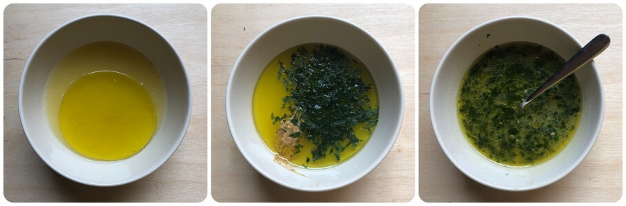 Doe in een klein kommetje het sap van een halve citroen, 15 ml olie, de mosterd en een eetlepel fijngehakte peterselie en emulgeer het geheel.