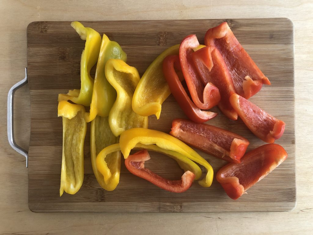 Was de paprika’s, droog ze, verwijder alle zaden en witte draden binnenin en snijd ze in reepjes.