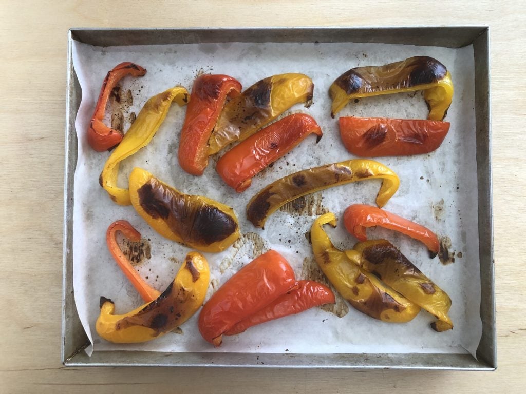 Leg ze op een met bakpapier beklede bakplaat en bak ze 10 minuten in een voorverwarmde statische oven op 180°C, draai ze om en bak ze nog eens 10 minuten. Schakel vervolgens de grillstand in tot ze goed geroosterd zijn. Dit duurt ongeveer vijf minuten meer. Als alternatief, zoals ik in de introductie zei, kun je de paprika’s grillen op een grillpan of op een hete geribbelde plaat, waarbij je ze vaak omdraait.