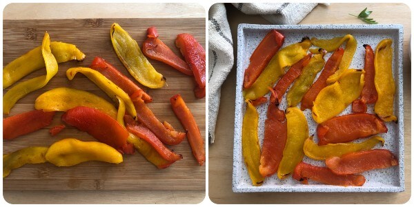 Haal de paprika’s uit de oven, verwijder het verbrande vel (dit maakt ze beter verteerbaar) en leg ze op het serveerbord.