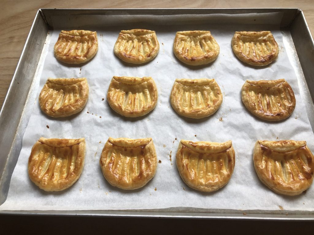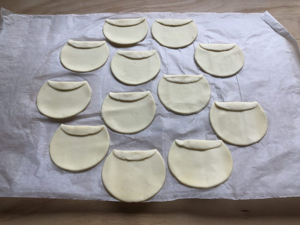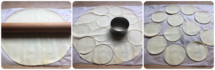 Rol de schijf bladerdeeg uit, rol er voorzichtig overheen met de deegroller en snijd 12 cirkels uit met een deegsnijder of een glas met een diameter van 8 cm. Let op… gooi de restjes bladerdeeg niet weg maar gebruik ze om een zoet of hartig hapje te maken.