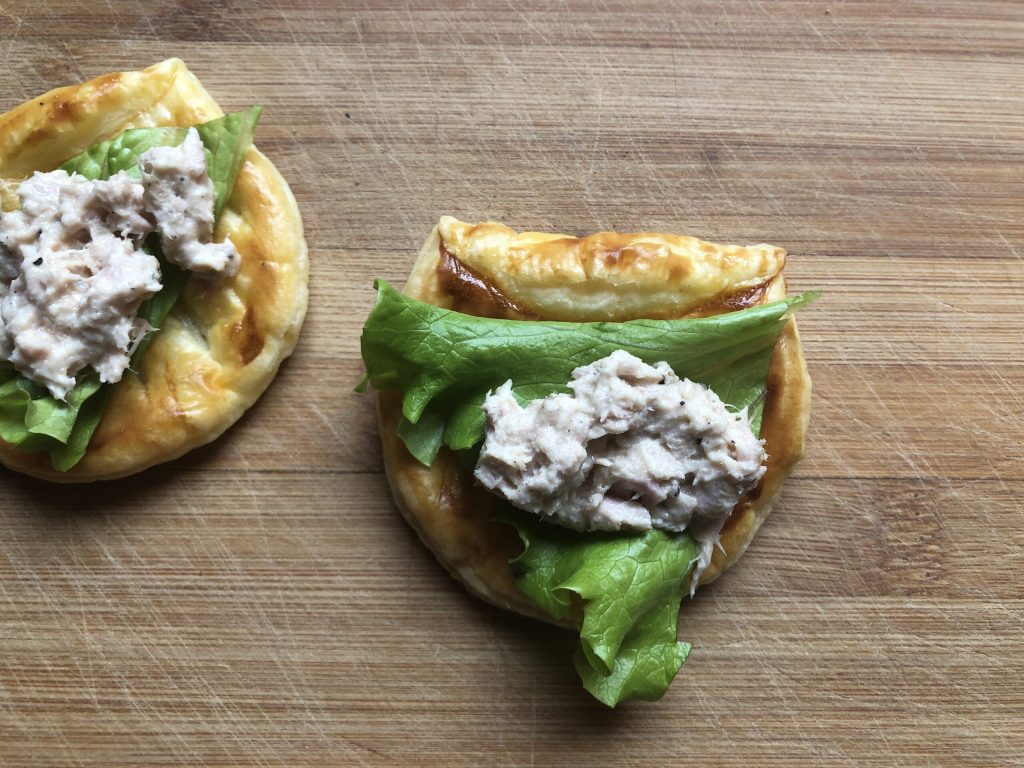 Leg op elk bladerdeegje een klein blaadje zachte sla.