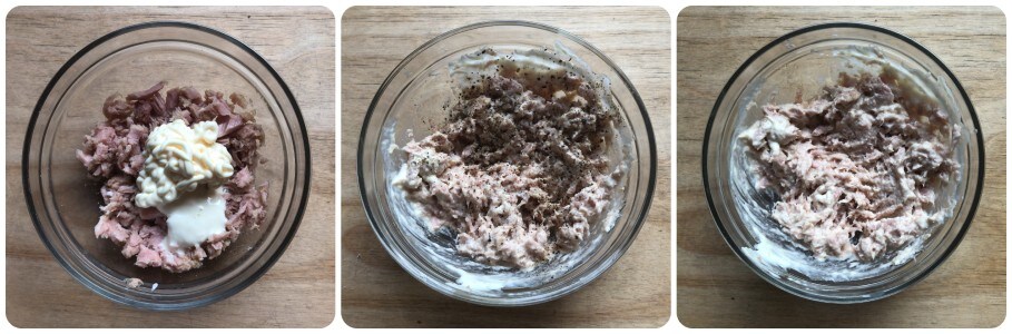 Laat de tonijn goed uitlekken, hak het fijn, doe het in een klein kommetje en meng het met de mayonaise tot een crème. Zout en peper naar smaak.