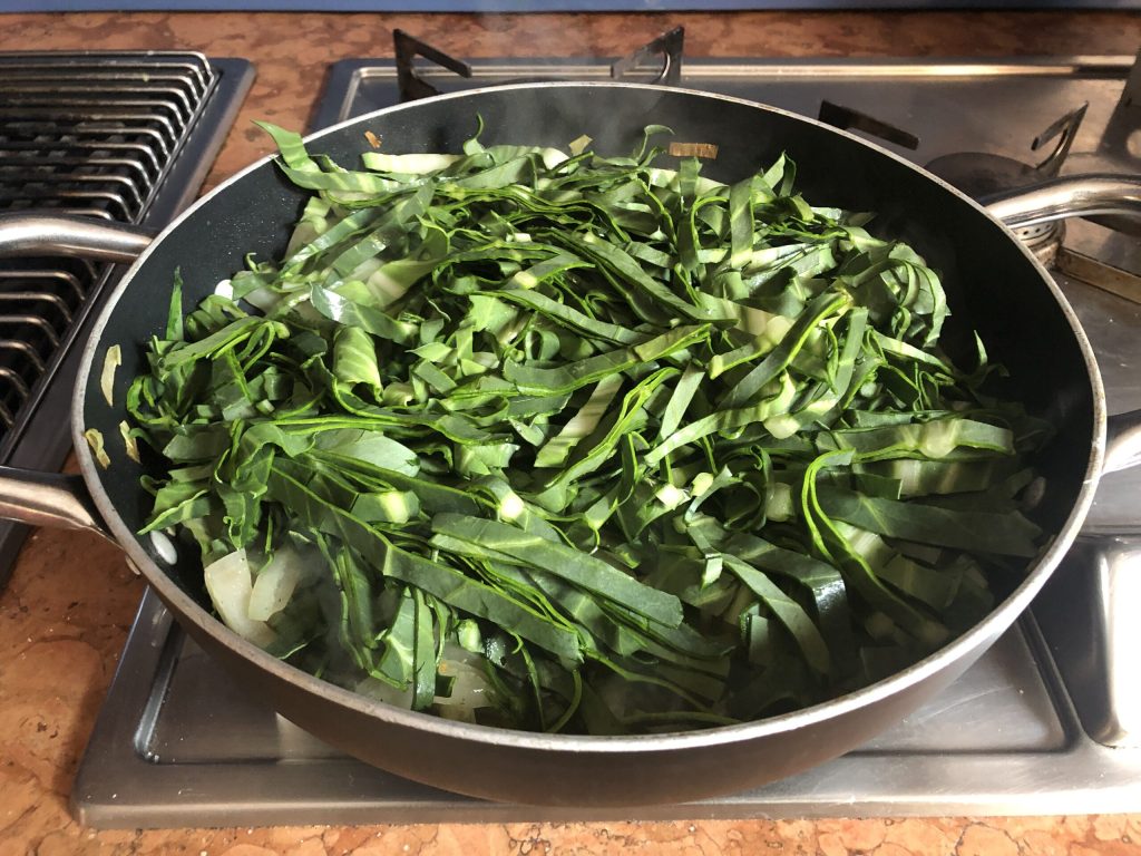 Bak op middellaag vuur gedurende 2/3 minuten, voeg dan de gesneden stelen toe. Zout en peper naar smaak en laat nog eens 3 minuten bakken, regelmatig roeren.