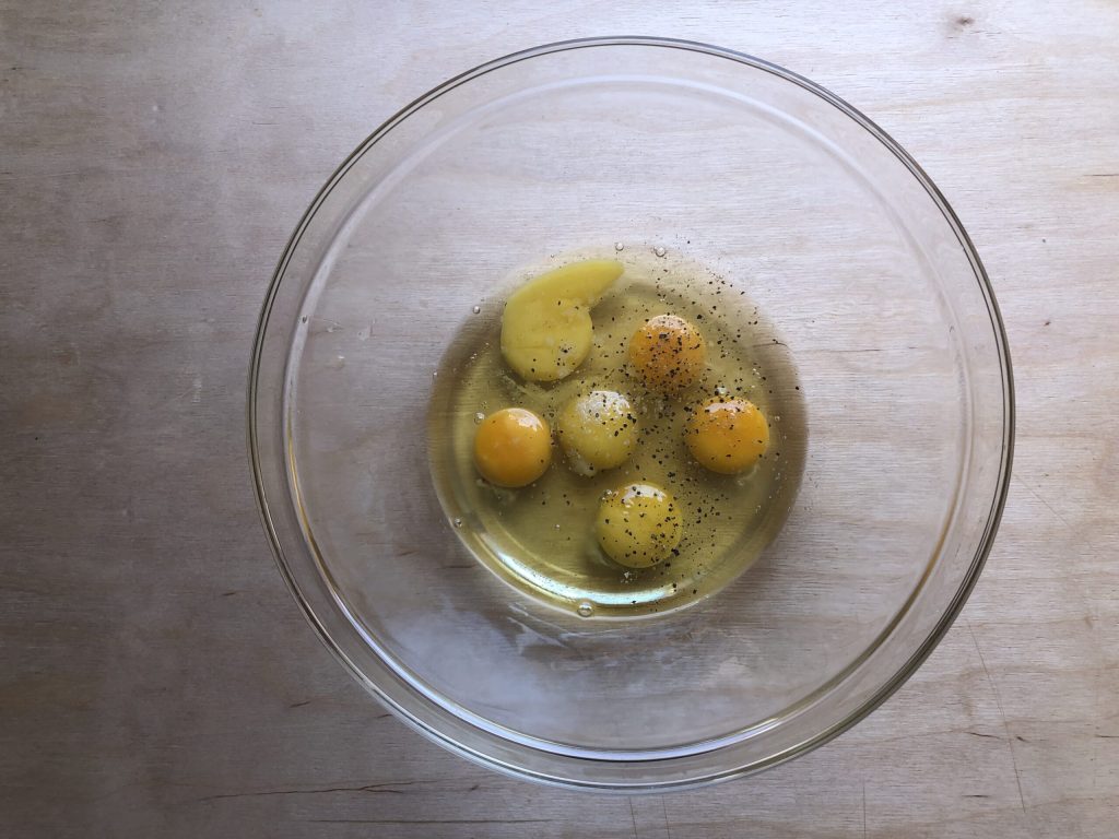• Breek de eieren in een grote kom, voeg een snufje zout en een snufje zwarte peper toe en klop ze met een kleine handklopper tot de dooiers en eiwitten gemengd zijn.