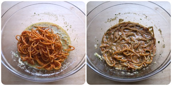 • Voeg ten slotte de spaghetti toe en meng alle ingrediënten goed.