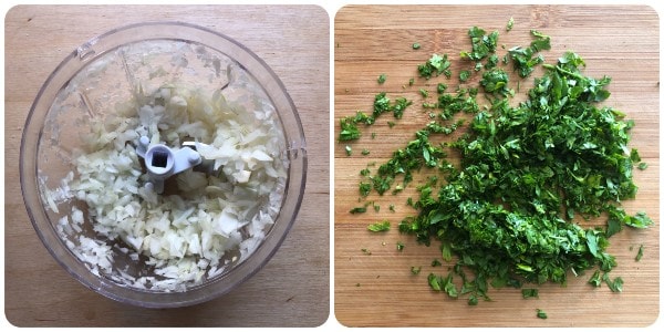 • Pel de ui en hak deze fijn. Ik heb een handmatige touwhakker gebruikt, echt handig. Als u deze wilt kopen, kunt u deze vinden door te klikken HIER.