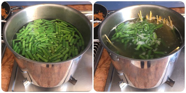 Breng in een kookpot ruim gezouten water aan de kook. Voeg de sperziebonen toe en kook ze vijf minuten voordat je de spaghetti toevoegt.