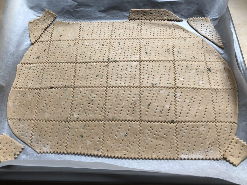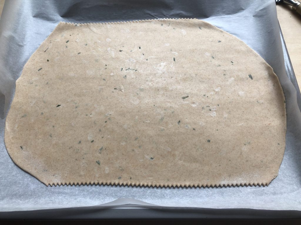 Na de rusttijd het deeg met een deegroller uitrollen tot een heel dunne plak. Hoe dunner, hoe knapperiger uw speltcrackers zullen zijn. Deze stap is erg belangrijk omdat er geen boter of reuzel in de ingrediënten zit en als u ze te dik laat, riskeert u taaie crackers te krijgen.