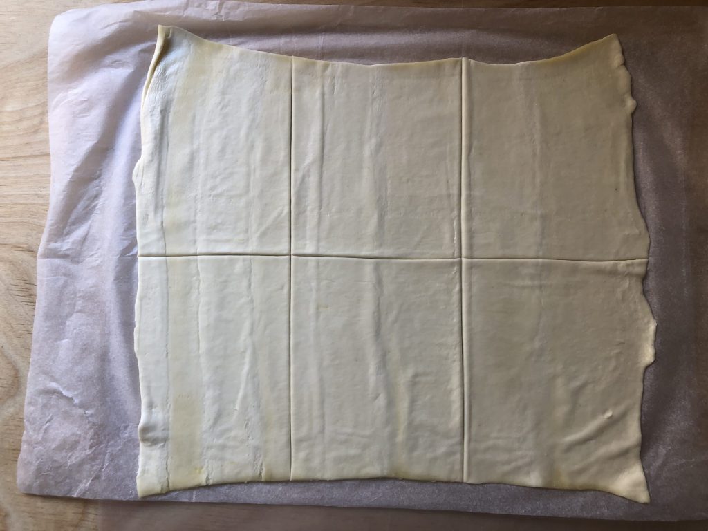 • Rol de eerste verpakking bladerdeeg uit en verdeel deze in 6 rechthoeken.