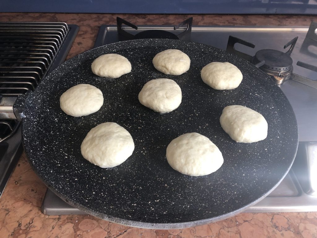 Bak ze tot de onderkant goudbruin is, draai ze dan om. Draai ze nog een paar keer tot perfecte goudbruine kleur. Binnen enkele minuten zijn de panbroodjes klaar. Vergeet niet het vuur laag te houden, want het geheim voor een perfecte bereiding is om de plaat goed heet te maken.